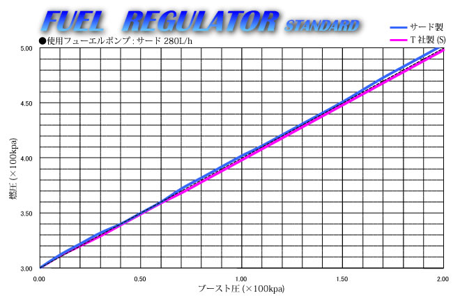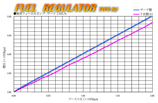 性能評価テストの結果を掲載。レギュレターに求められる性能。それはブースト上昇に合わせ燃圧も比例して上昇すること。